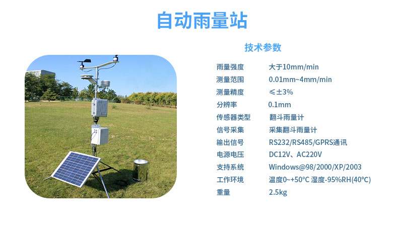 一體化雨量監(jiān)測站集成降雨量計設計合理、準確、可靠,外觀美觀,使用方便,可以通過后端計算機設置各種參數(shù)并接收數(shù)據(jù)。電池采用大容量、高可靠性的充電電池。根據(jù)現(xiàn)有水行業(yè)標準設計了自動氣象降雨利用數(shù)據(jù)接收軟件實現(xiàn)了遠程參數(shù)的設置、讀取、數(shù)據(jù)讀取和數(shù)據(jù)處理。一體化雨量降水數(shù)據(jù)也是水資源分析和評價的重要信息,一個地區(qū)的降水規(guī)律是其生態(tài)環(huán)境的重要標志,在經(jīng)濟發(fā)展中起著重要作用,自動雨量監(jiān)測站是一種自動降雨記錄儀,可作為移動式自動記錄站使用,具體的講,所述雨量簡為國標雨量筒,所述雨量筒分布設置在公路雨量監(jiān)測點。